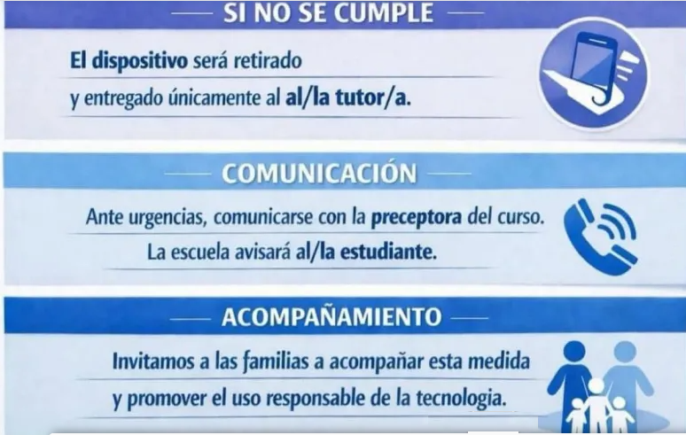 Para situaciones de urgencia, las familias podrán comunicarse con la preceptora del curso, y será la escuela la que avise al alumno. Invitan a las familias a acompañar esta medida, fomentando el uso responsable de la tecnología.